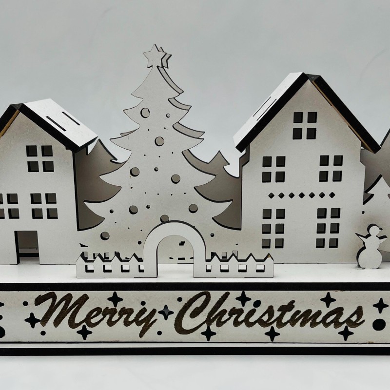 White wood Christmas light up decoration - two different scenes - village with tree and houses or a carousel. Hand assembled with LED lights